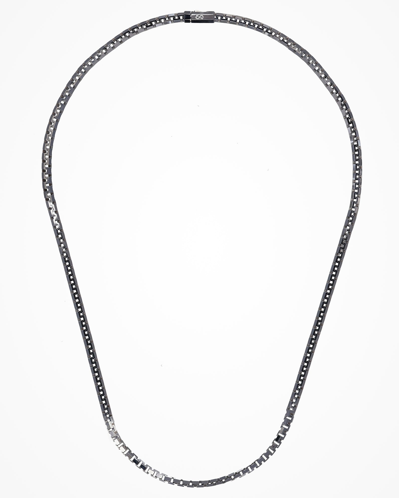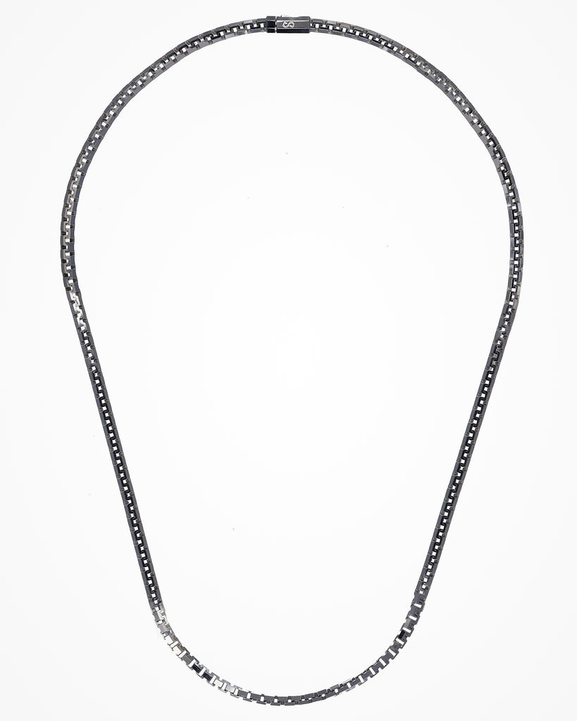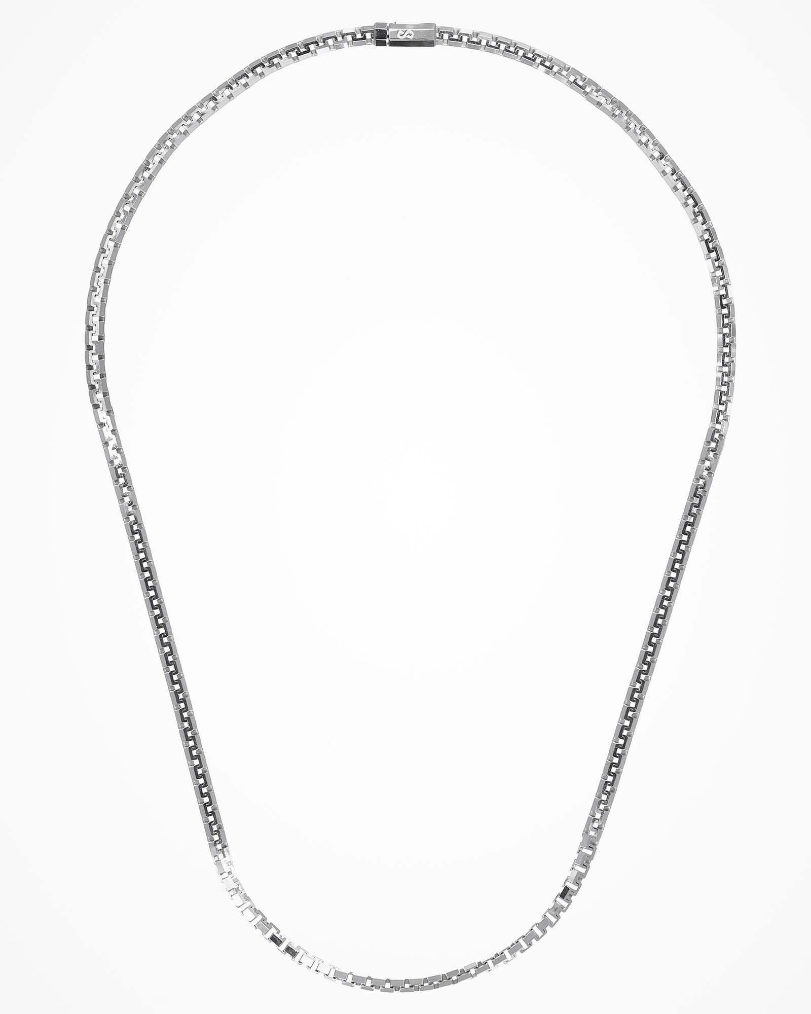 Silberne Halskette mit quadratischer, dreidimensionaler Kette.