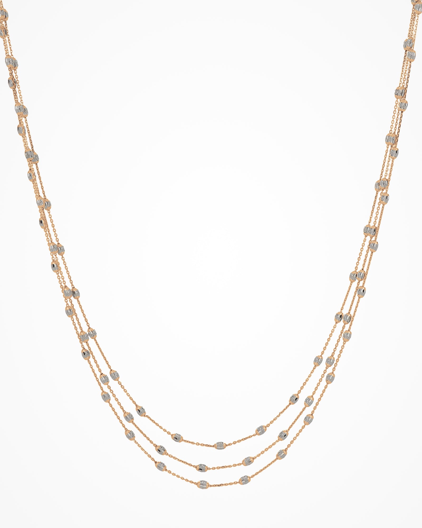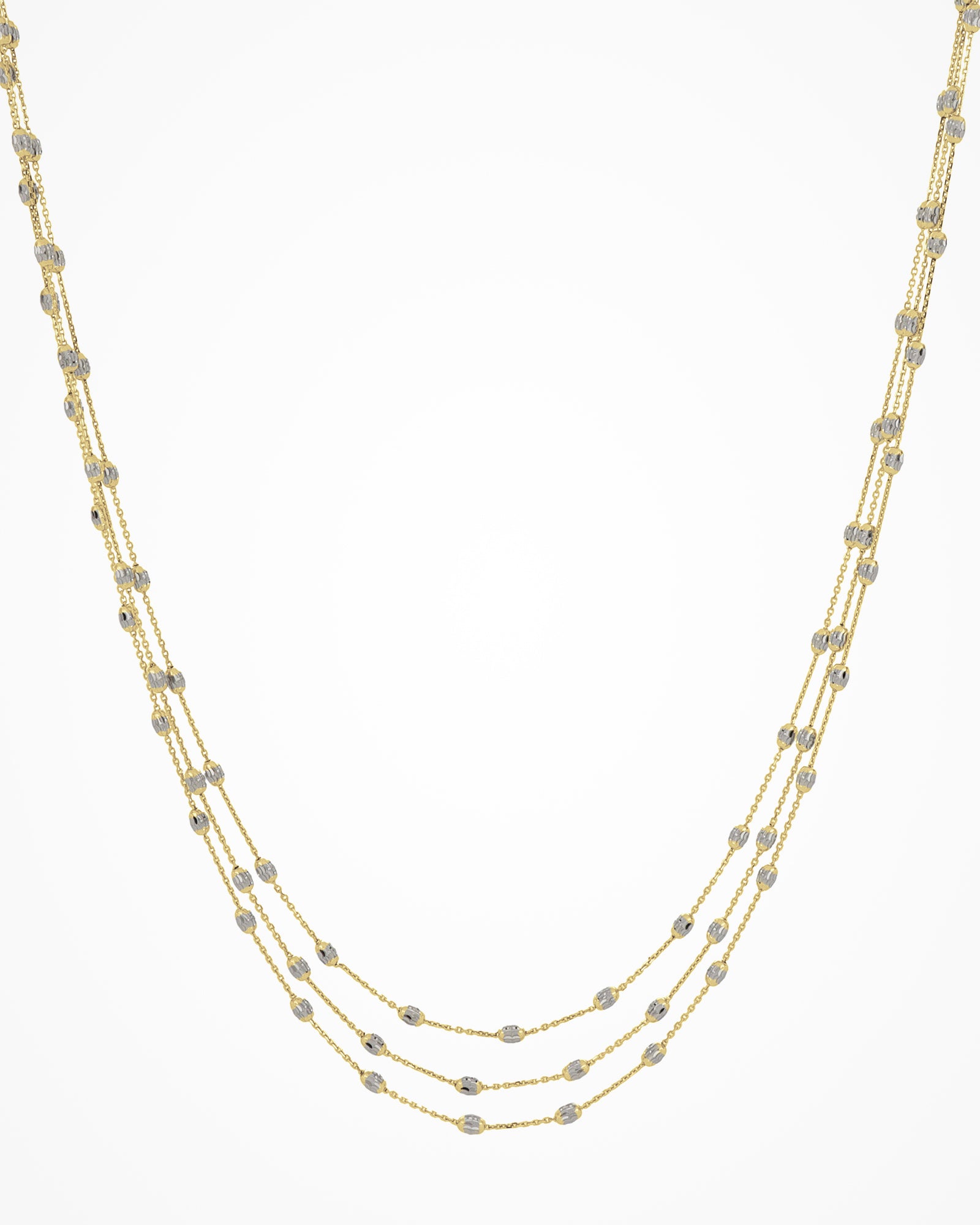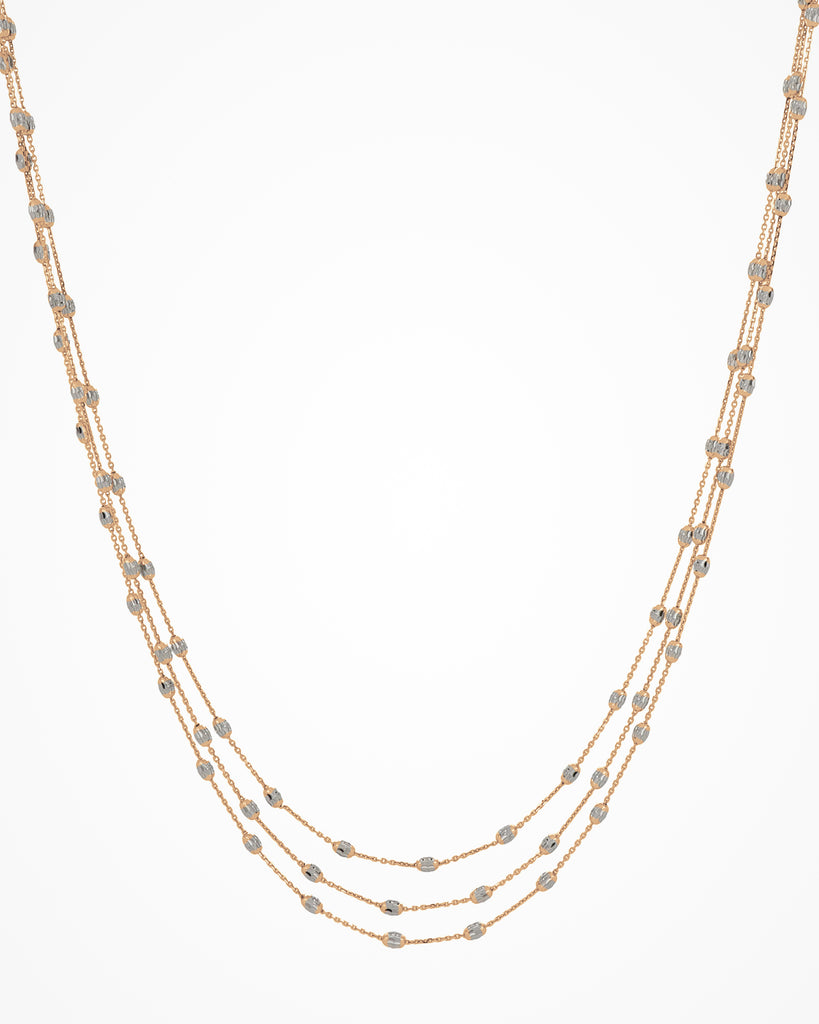 Mehrreihige Goldkette mit drei dünnen Ketten und ovalen Elementen, die durch ein spezielles Diamantschliffverfahren besonders schön zur Geltung kommen.