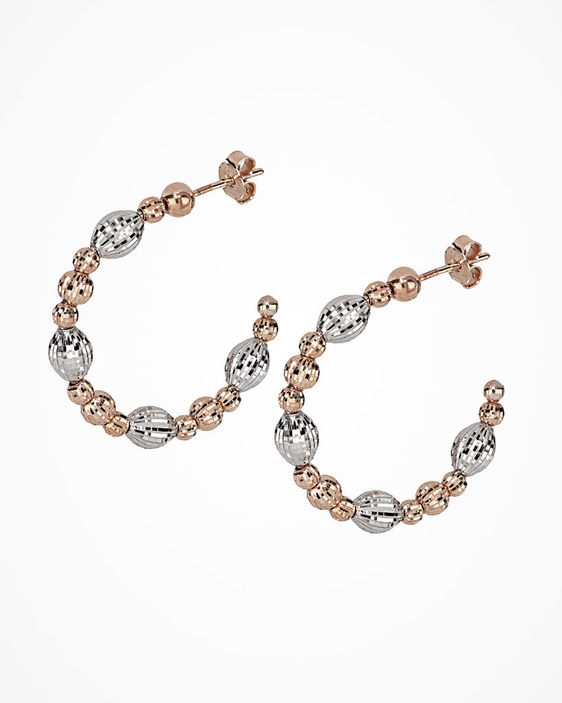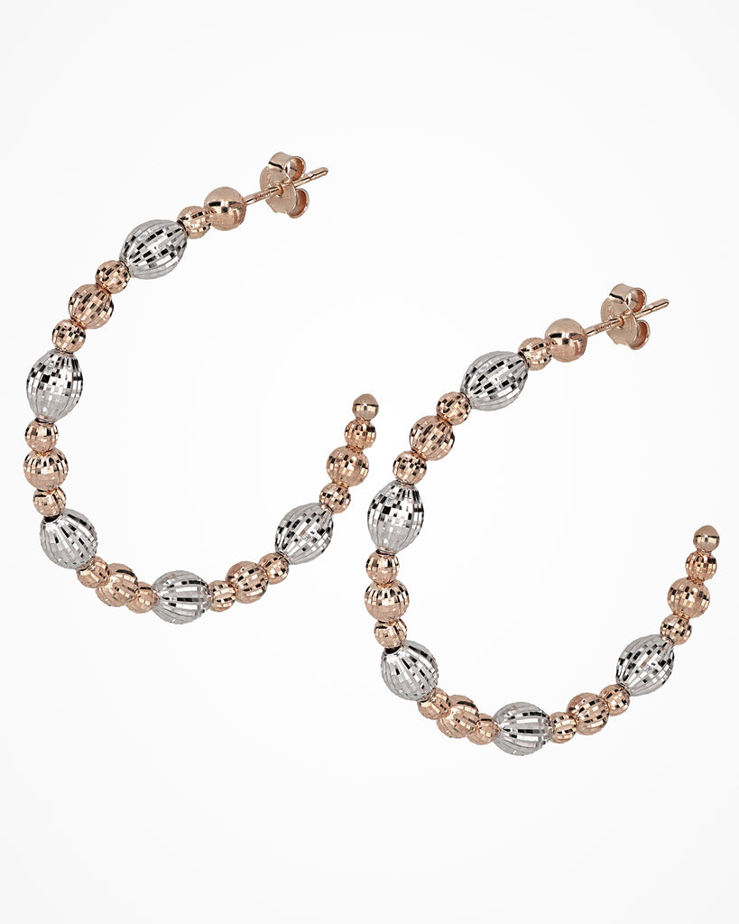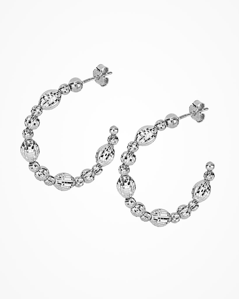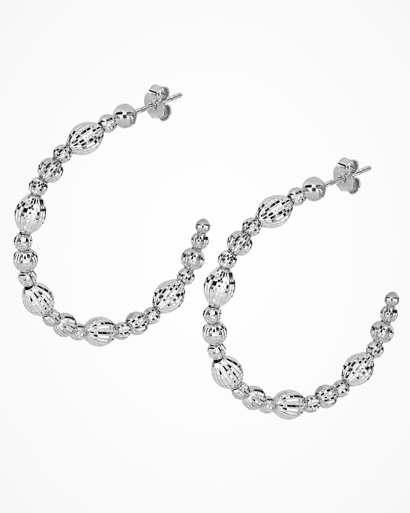 Silberne Creolen mit aufgefädelten, diamantgeschliffenen Kugeln. Die drei Elemente haben unterschiedliche Formen und erzeugen so ein faszinierendes Spiel von Dicke und Licht.