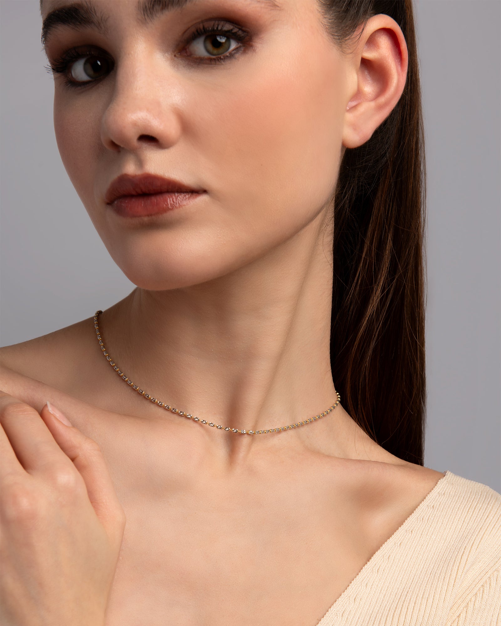Silberne Halskette mit einer dünnen Kette aus diamantgeschliffenen zylindrischen Elementen, die einen einzigartigen, lang anhaltenden Glanz verleihen.