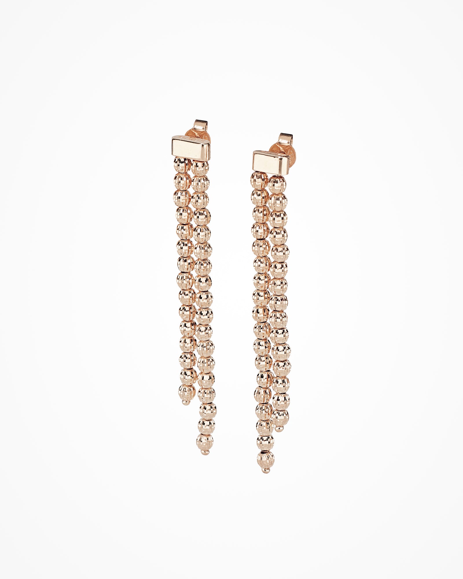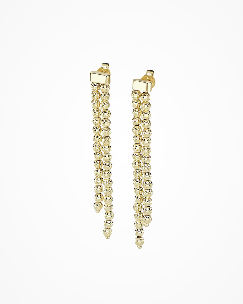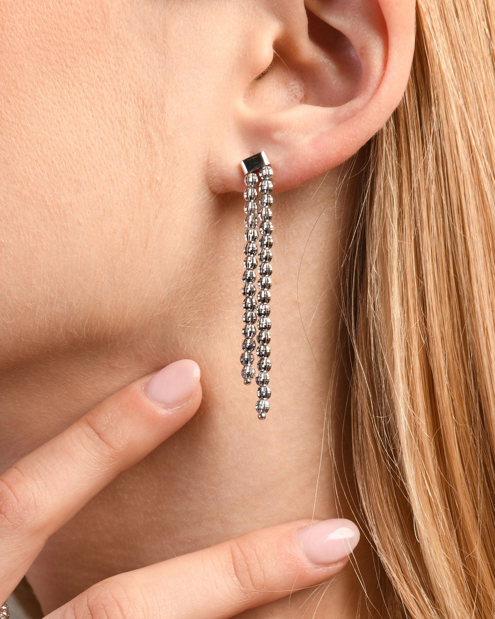 Silberne Ohrhänger mit einer doppelten Reihe diamantgeschliffener Perlen für einen einzigartigen, lang anhaltenden Glanz.
