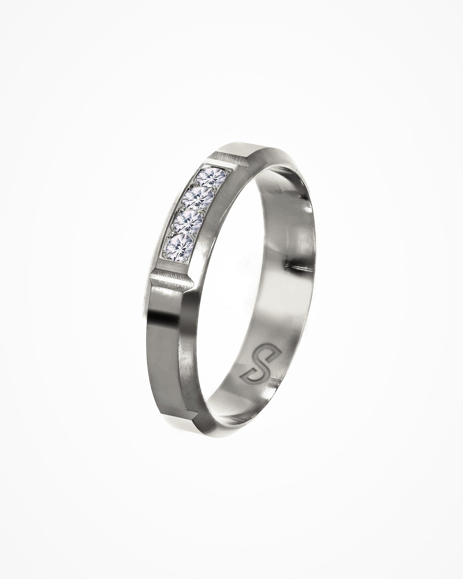Sterling silver band ring embellished with cubic zirconia.