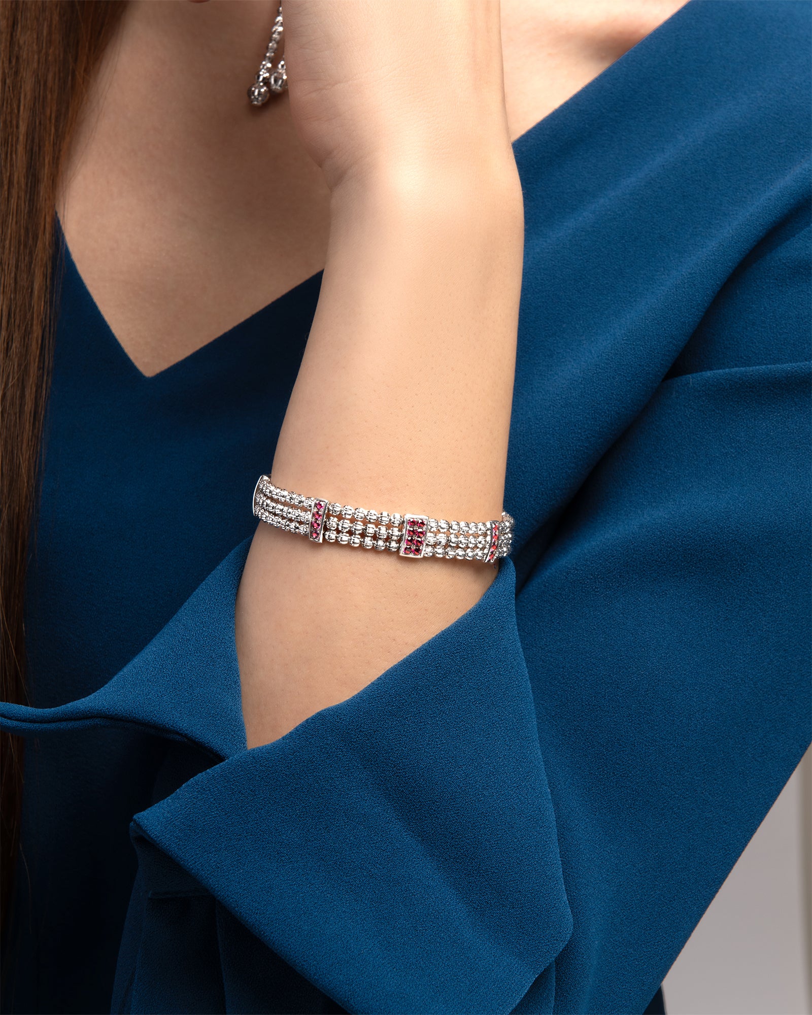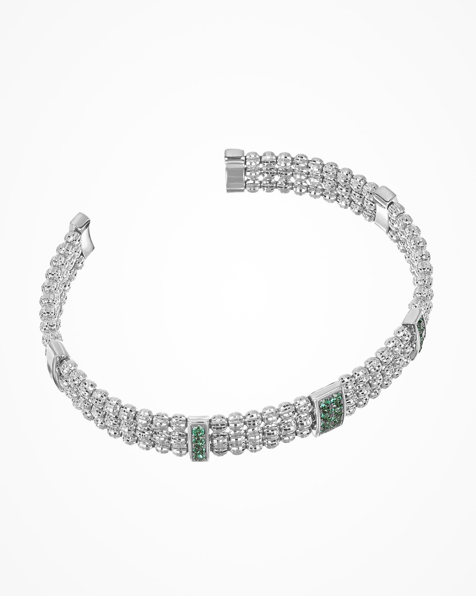 Beaded and diamond-cut silver bracelet embellished with cubic zirconia.