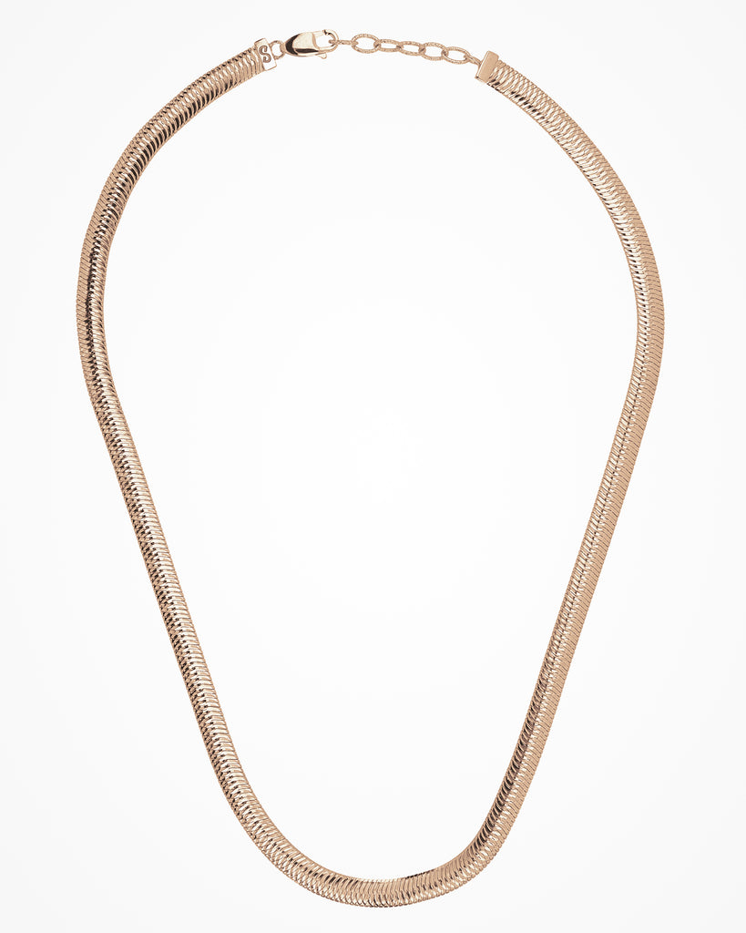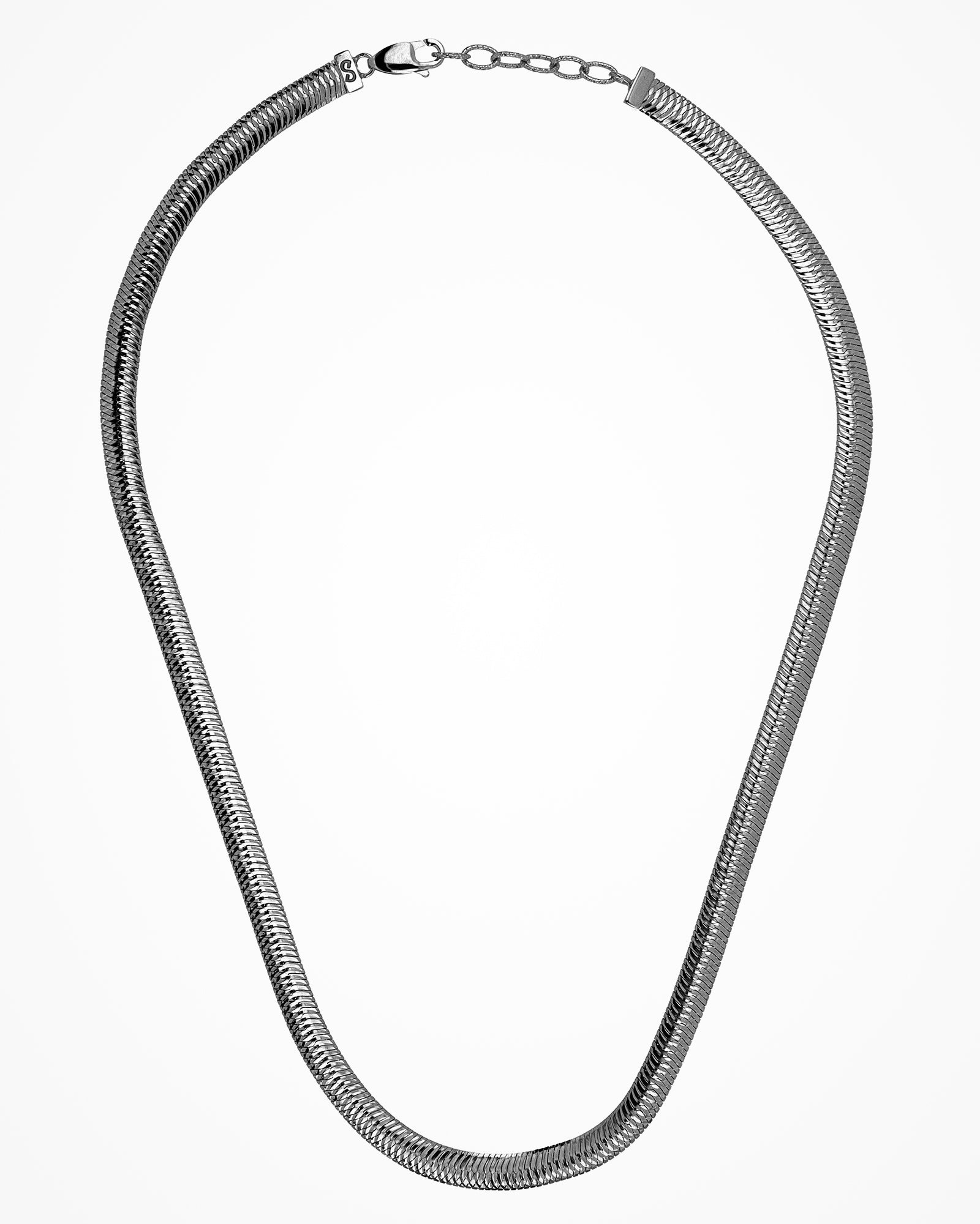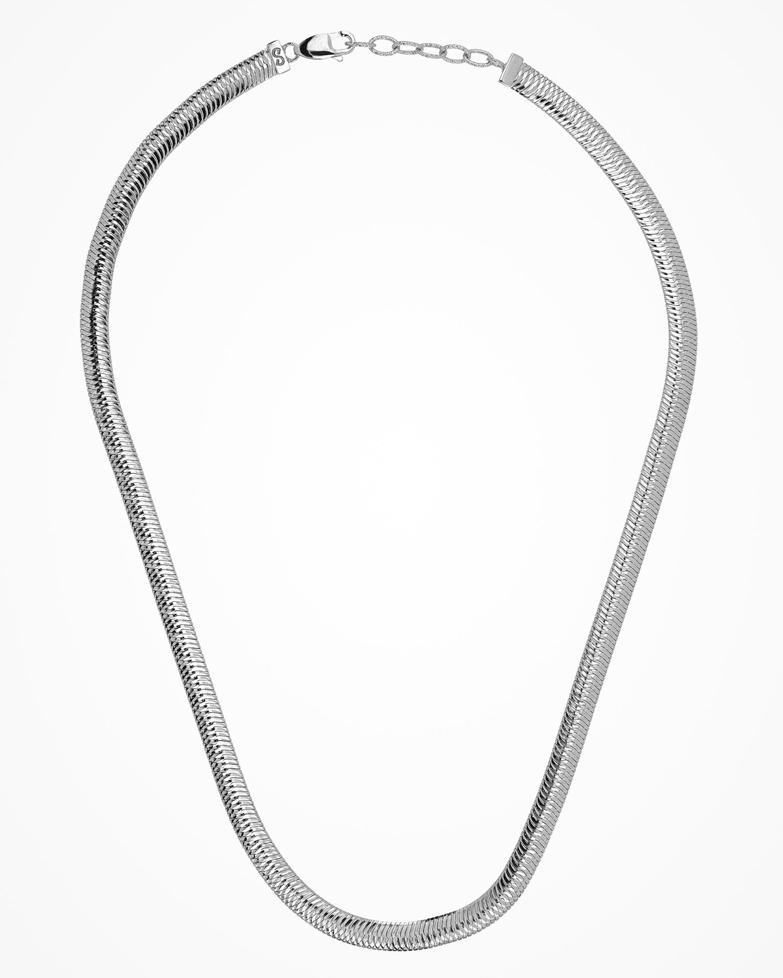 Silver necklace with flat sinuous chain and incredibly shiny effect.