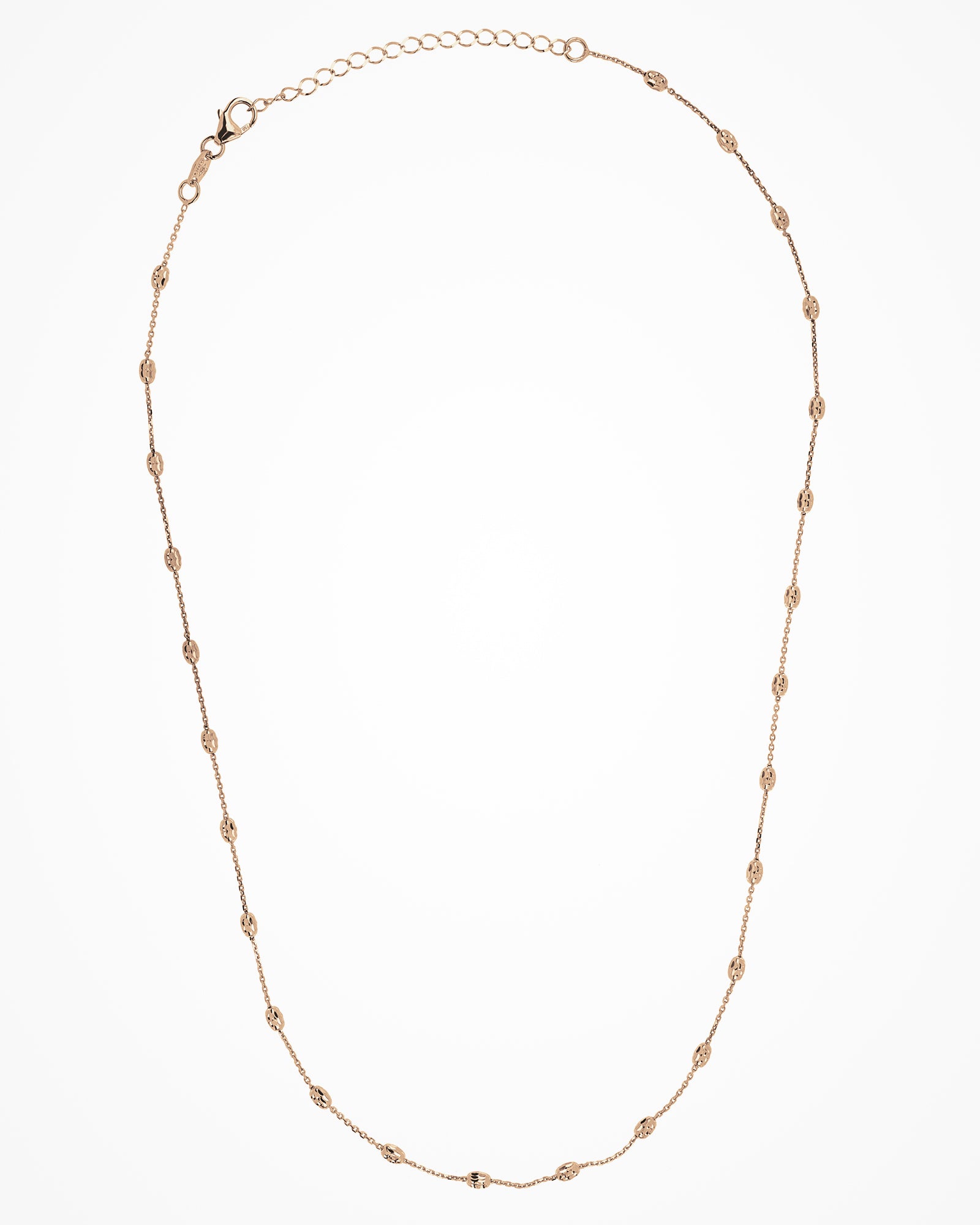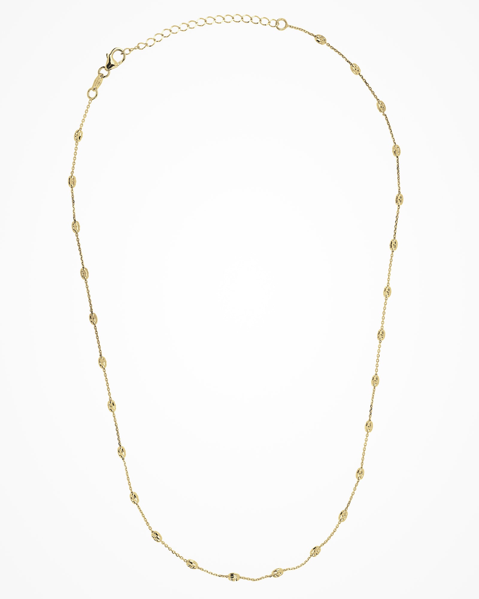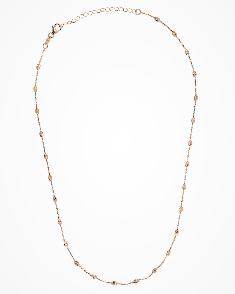 Collier en or avec une fine chaîne et des éléments ovales rendus brillants par un procédé spécial de taille de diamant.