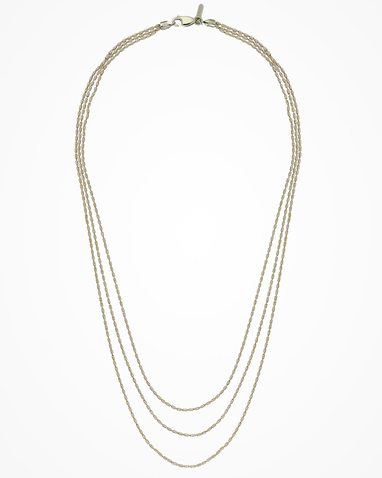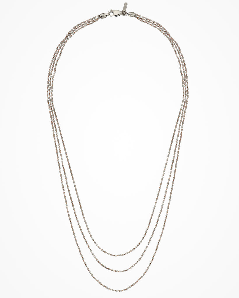 Collana in argento a tre file con piccoli elementi cilindrici, per un effetto luminoso ed elegante.