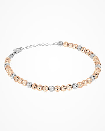 Bracciale in oro a palline infilate e diamantate, per regalarti una brillantezza unica e che dura nel tempo. Variante con tre palline rosa e una bianca.