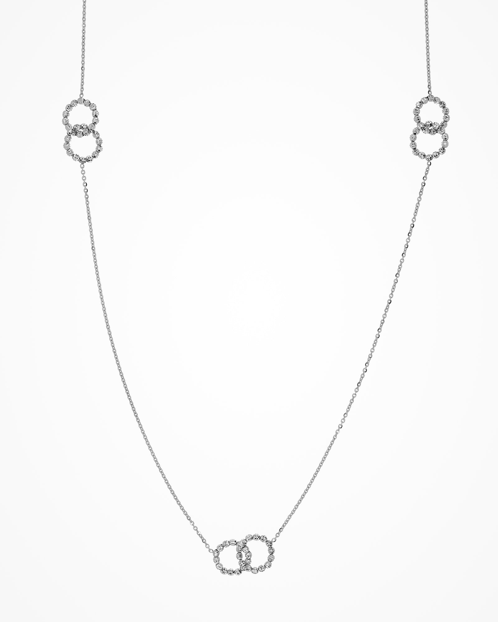 Collana in oro con motivi intrecciati e catena a piccole punte che suggerisce una nota rock. La diamantatura degli elementi infilati a mano regala una brillantezza unica che dura nel tempo.